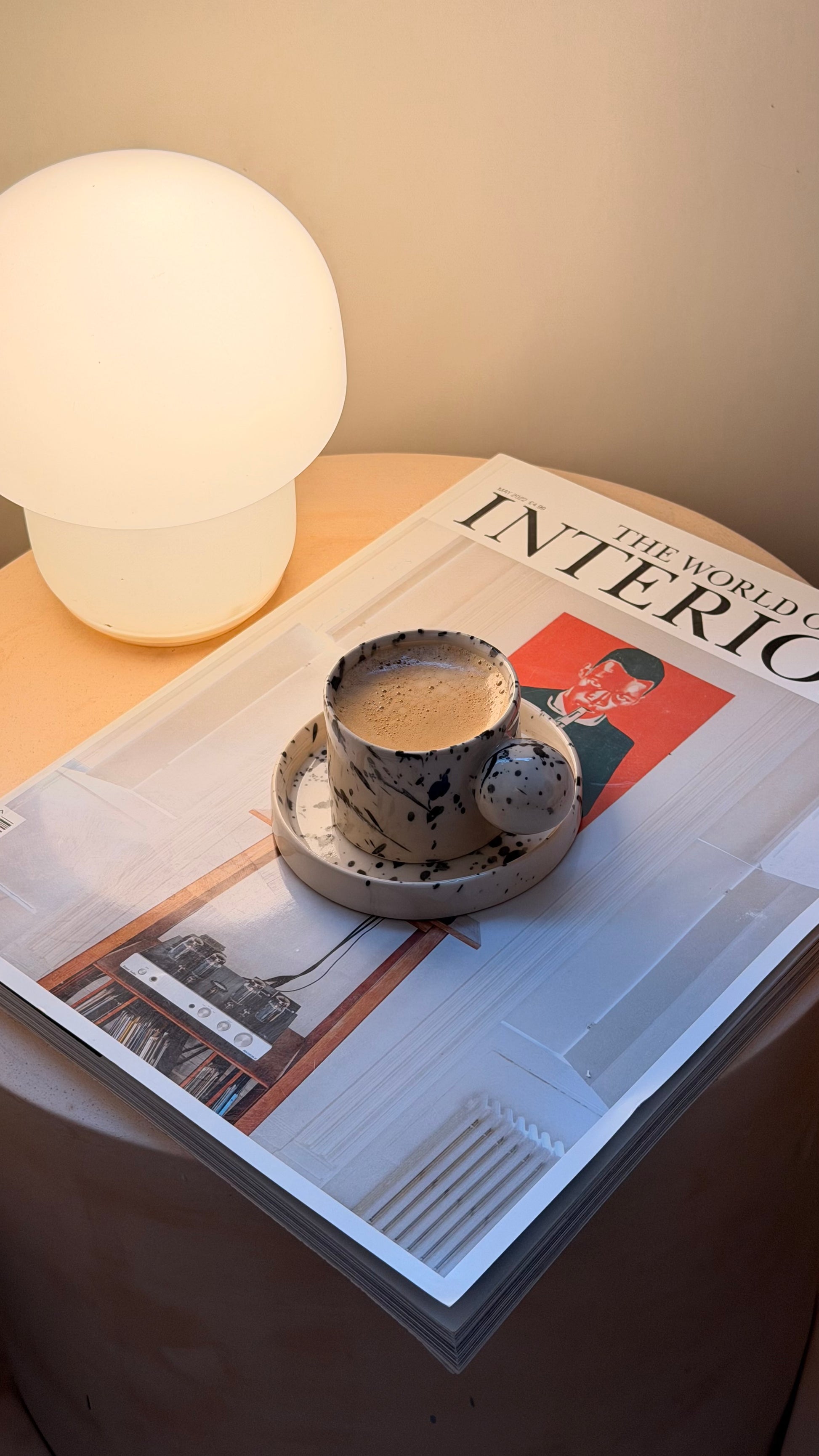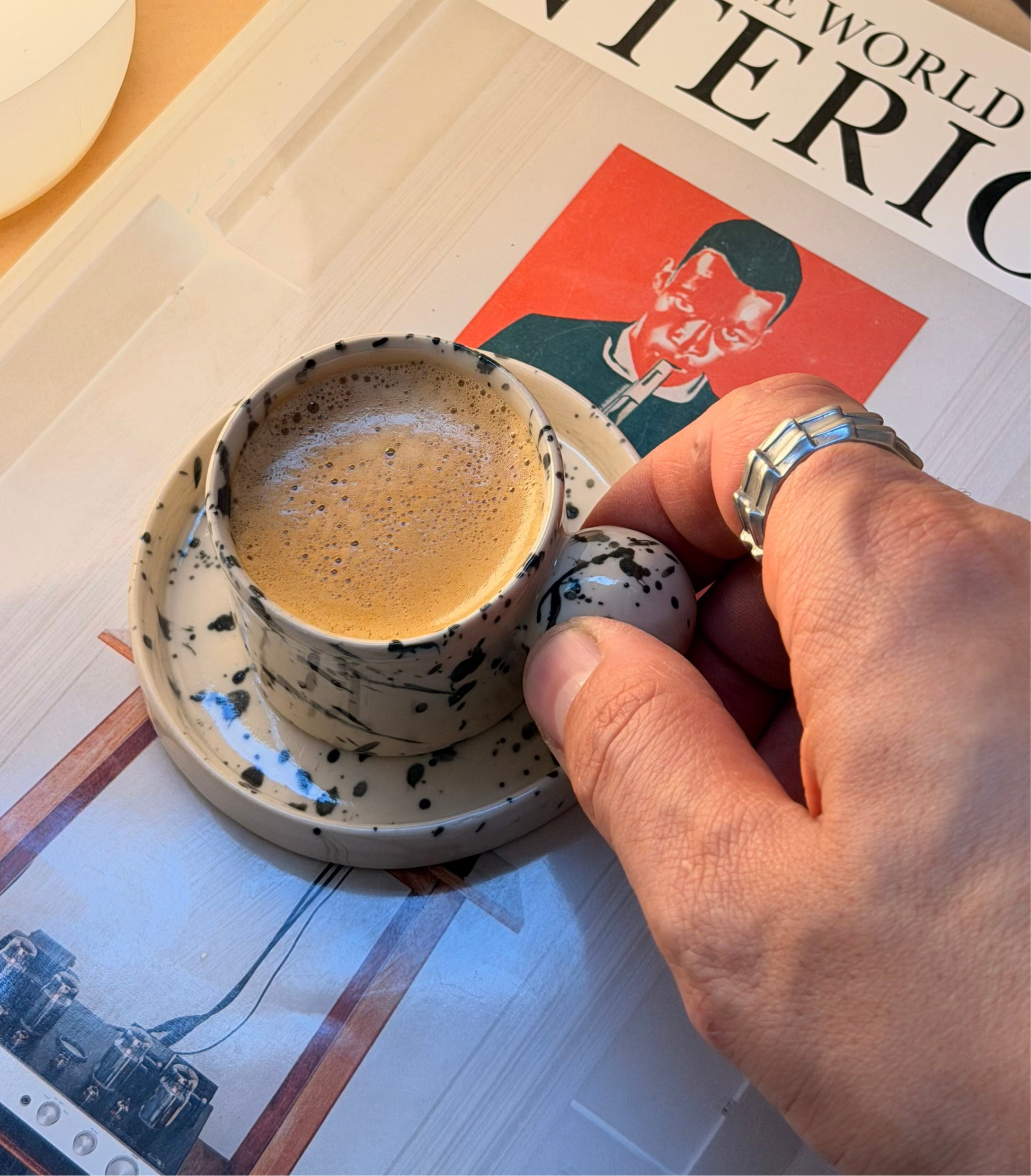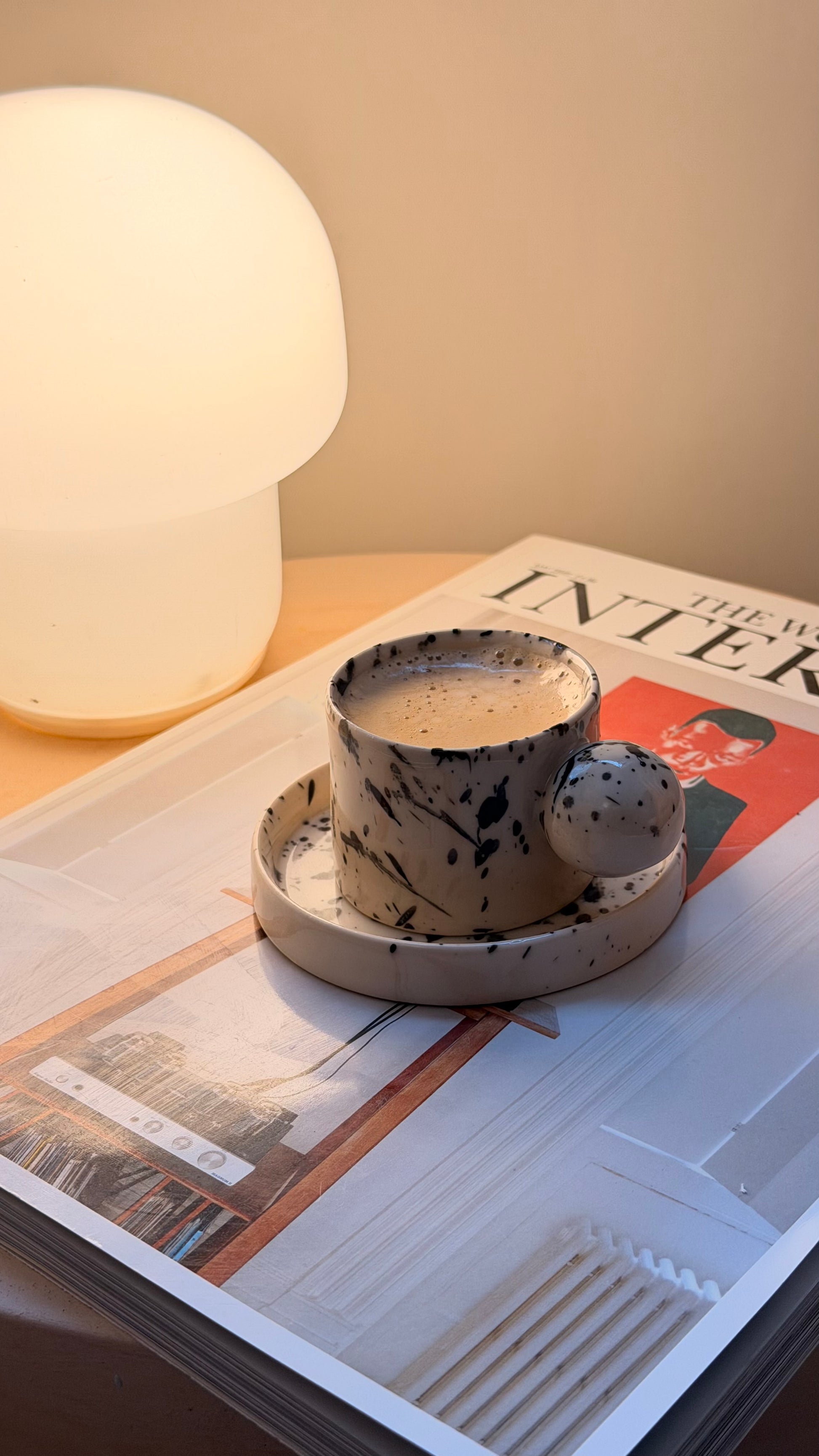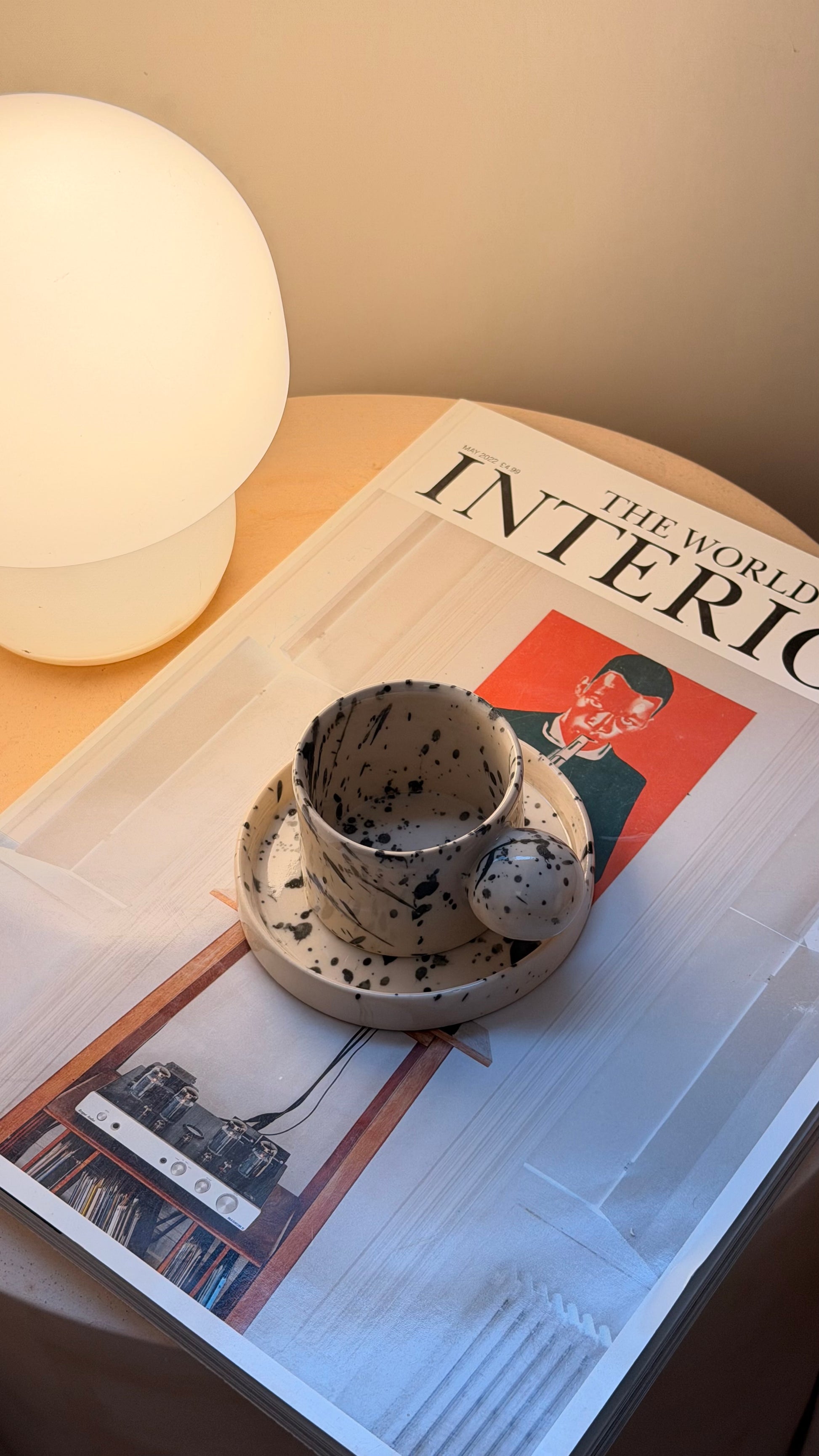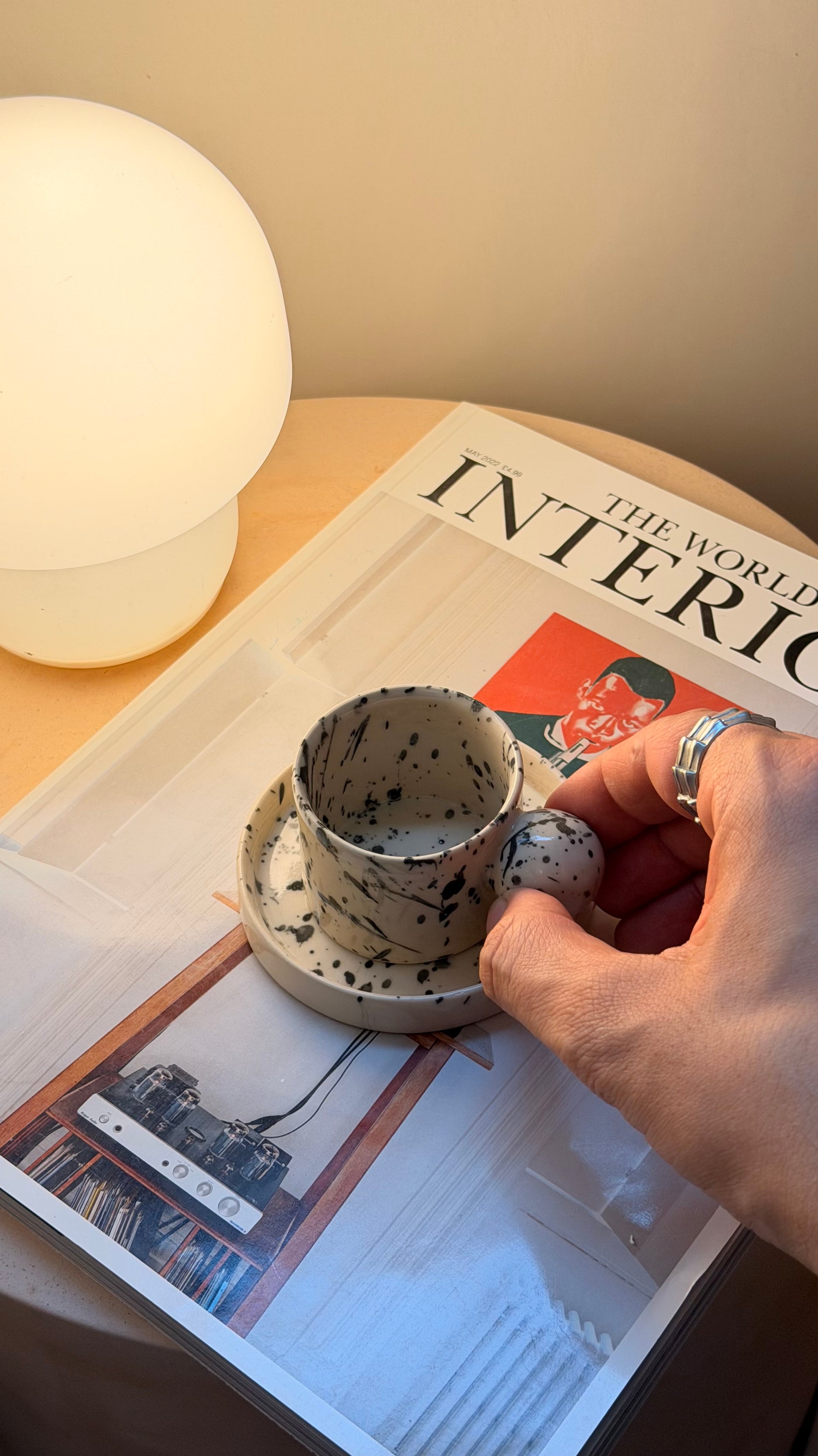 Ich habe diese Espressotasse und Untertasse mit schwarzem Griff und Spritzkugel angefertigt. Das Keramiktassen-Set wurde mit der Plattenmethode hergestellt und bei 1250 Grad gebrannt. Die handgefertigte Kaffeetasse aus Keramik hat die perfekte Größe für einen einzelnen Schuss. Die italienische Espressotasse ist ein handgefertigtes Geschenk, auf das Kaffeeliebhaber nicht verzichten werden. Mit ihrem außergewöhnlichen Design ist sie eine schöne Alternative, die Sie als Einweihungsgeschenk bevorzugen werden. Jede hergestellte Keramiktasse kann sich in Bezug auf Farbe, Textur und Form voneinander unterscheiden.