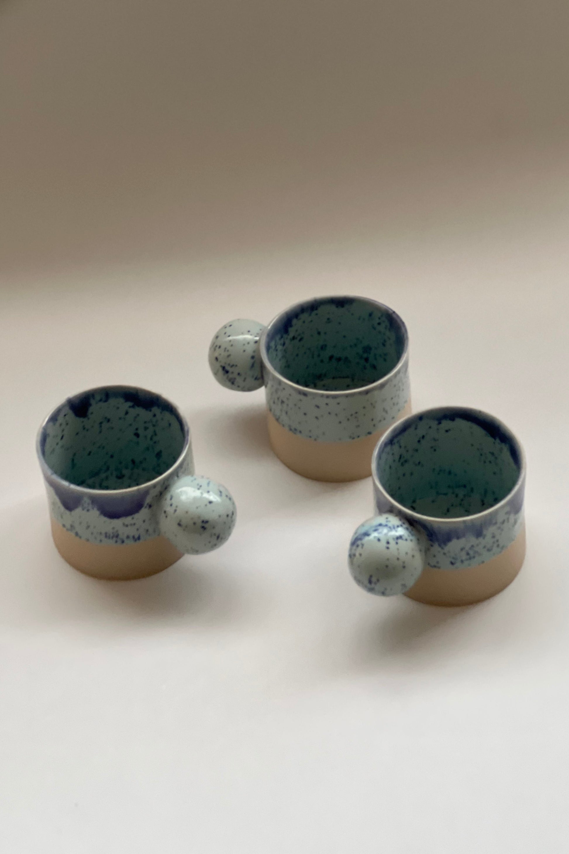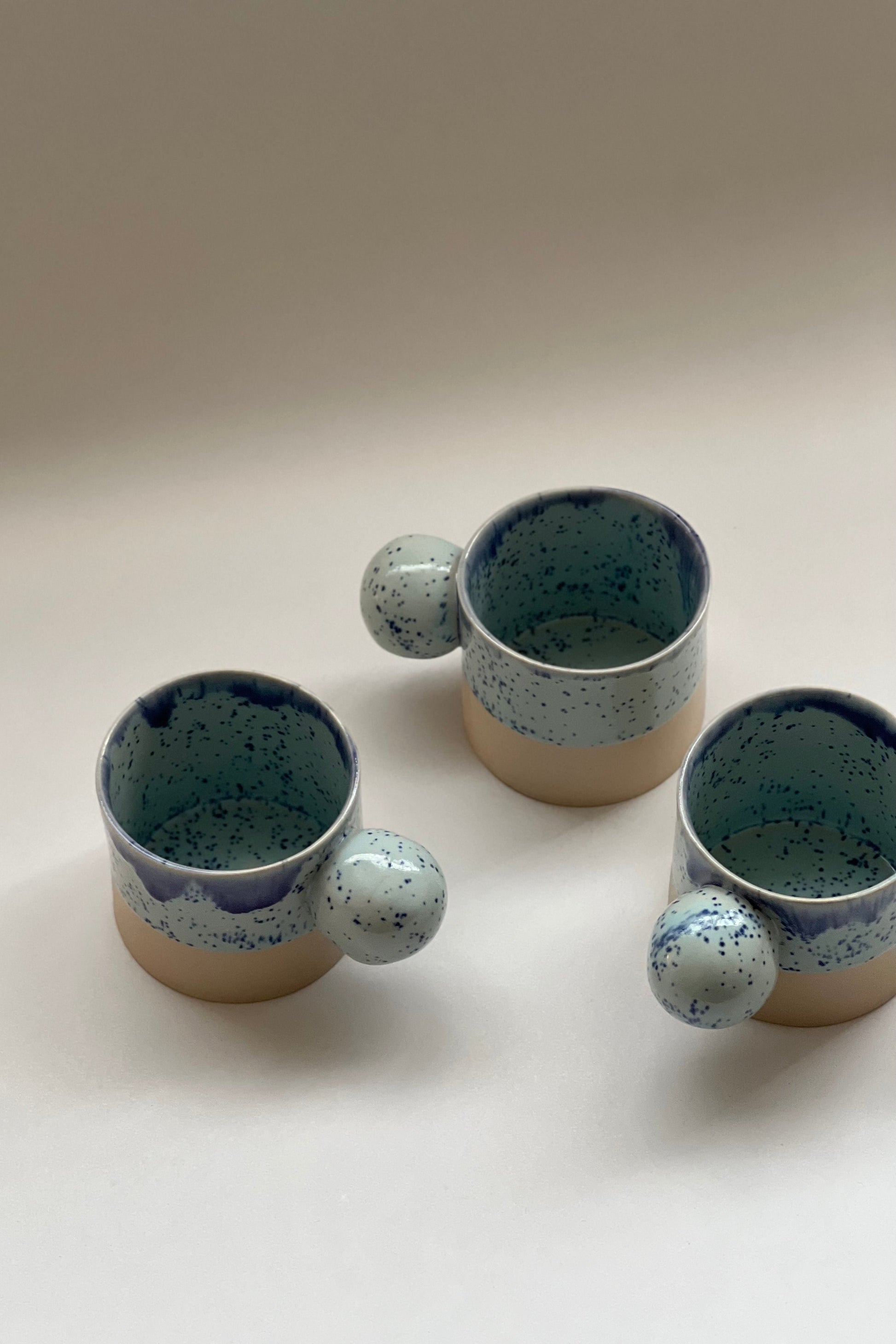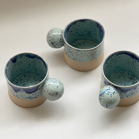 Cette tasse à café apporte chaleur et style à votre routine quotidienne. Tasse à café originale entièrement fabriquée à la main, sans moule. Fabriquée dans une combinaison de couleurs beige et bleu. Il s'agit d'une tasse de taille moyenne, elle est plus grande qu'une tasse à expresso. Cette tasse en céramique en grès est façonnée à la main et cuite à 1250°C. Elle est dotée d'une poignée en boule pratique et d'une finition brillante.