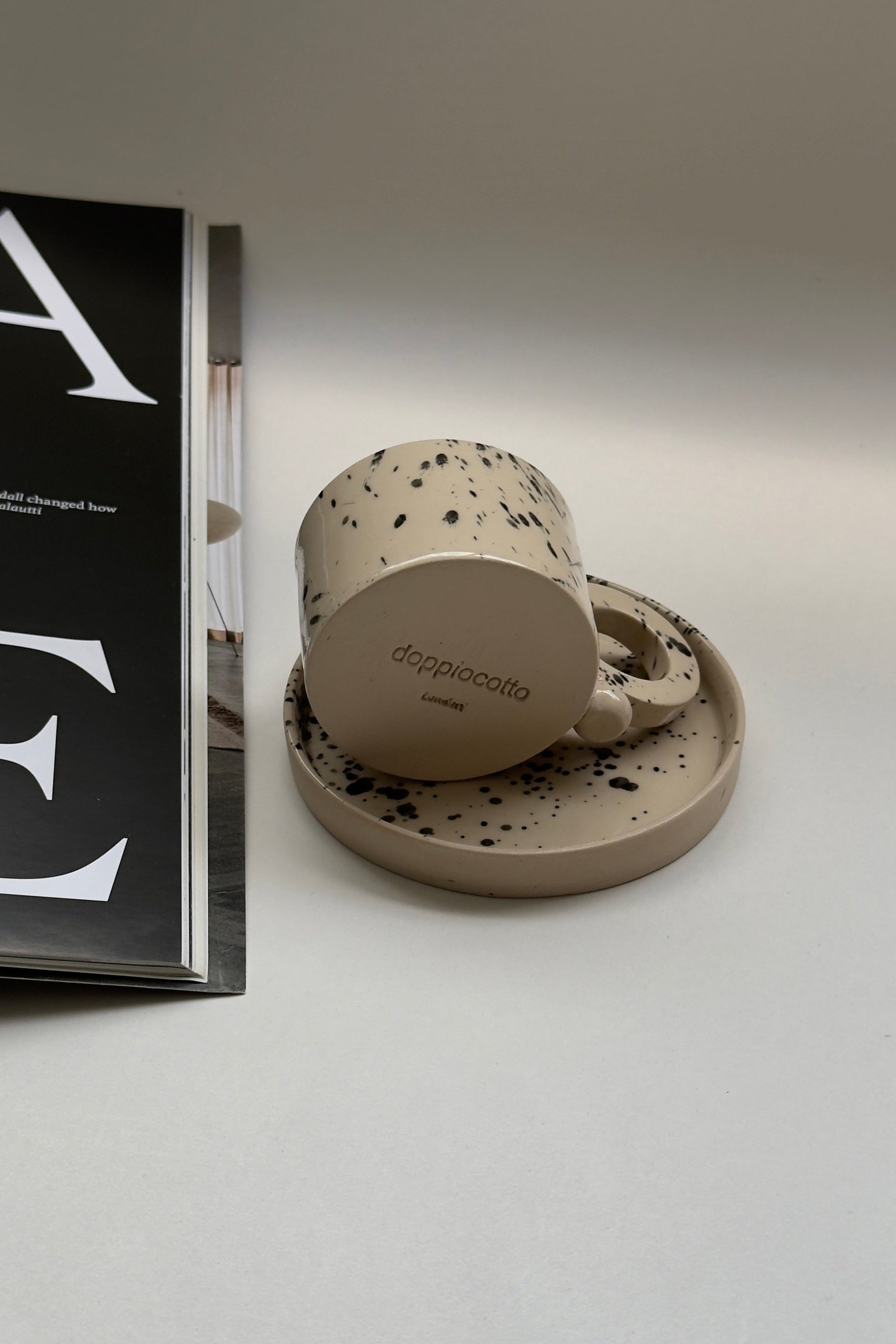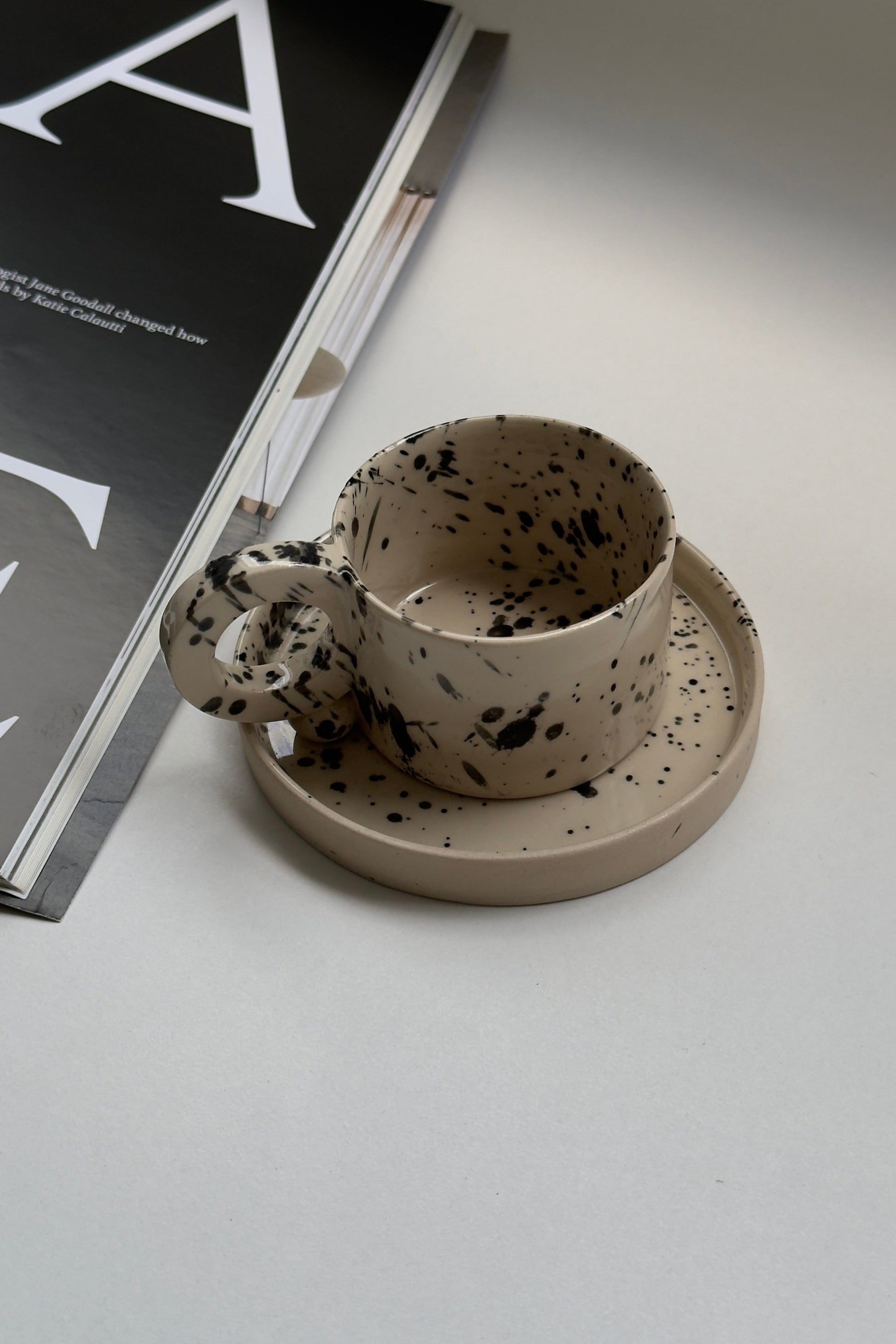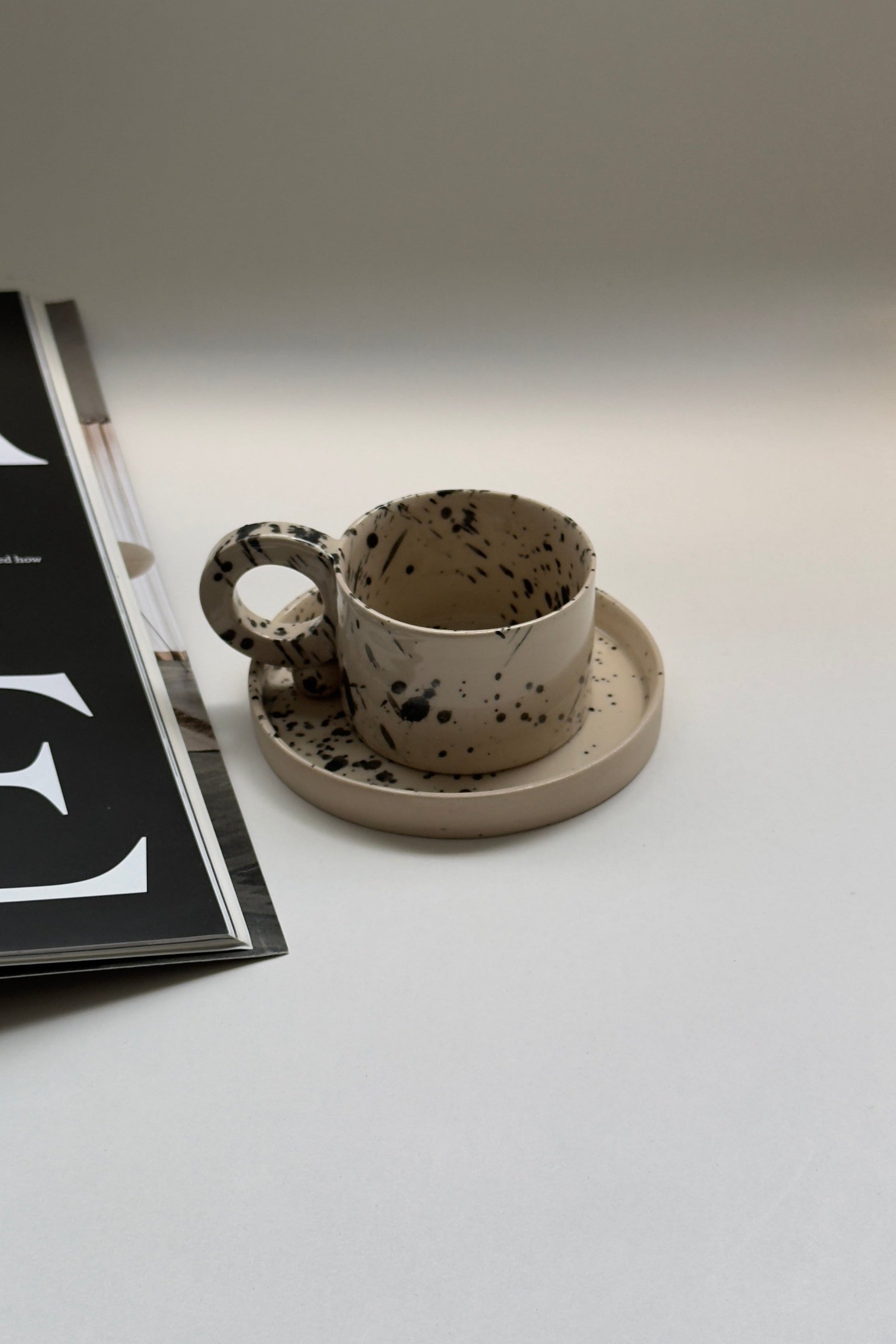 Ensemble tasse à expresso et soucoupe en grès fait main – Motif moucheté
